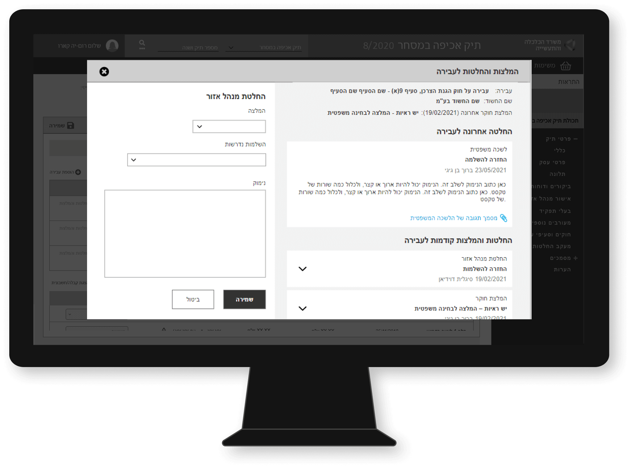 A view of the history of the decisions made regarding the case, including comments and attached documents and the possibility of entering a new decision.
